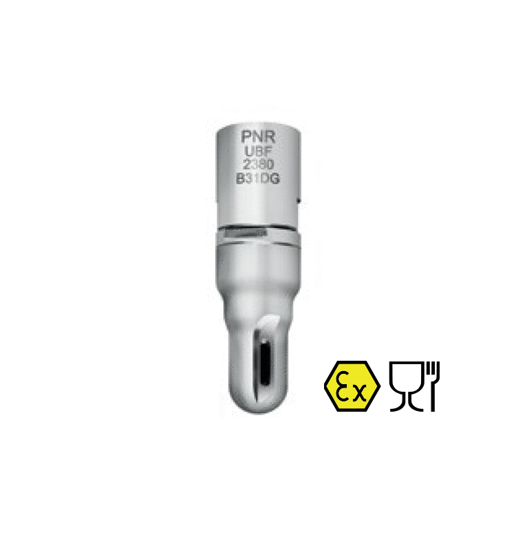 UBF旋轉噴頭,提供旋轉式的扇形清洗動作,全新設計的『喇叭形』噴⼝,可以產⽣⼤⾓度的扇形噴幅,並利⽤噴洗時的反作⽤⼒產⽣旋轉,25mm的超⼩外徑,讓UBF旋轉噴頭可以伸入⼩⼝徑的桶槽進⾏清洗,因此,UBF旋轉噴頭廣範應⽤在全球包裝飲⽤⽔及橡⽊酒桶的清洗作業。